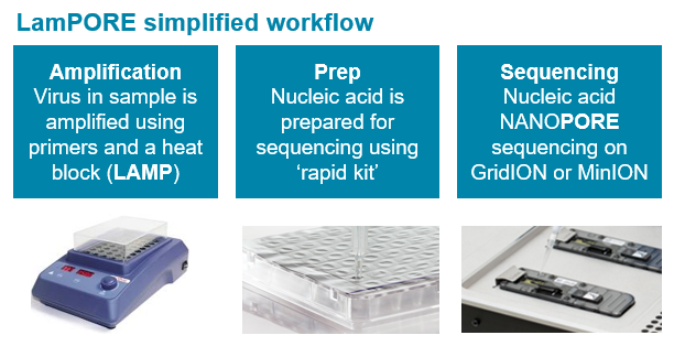 - Simple materials for precise results: With simple hardware requirements, LamPORE combines the established, rapid, low cost LAMP method for initial amplification of the virus with Oxford Nanopore sequencing for a precise, digital result.